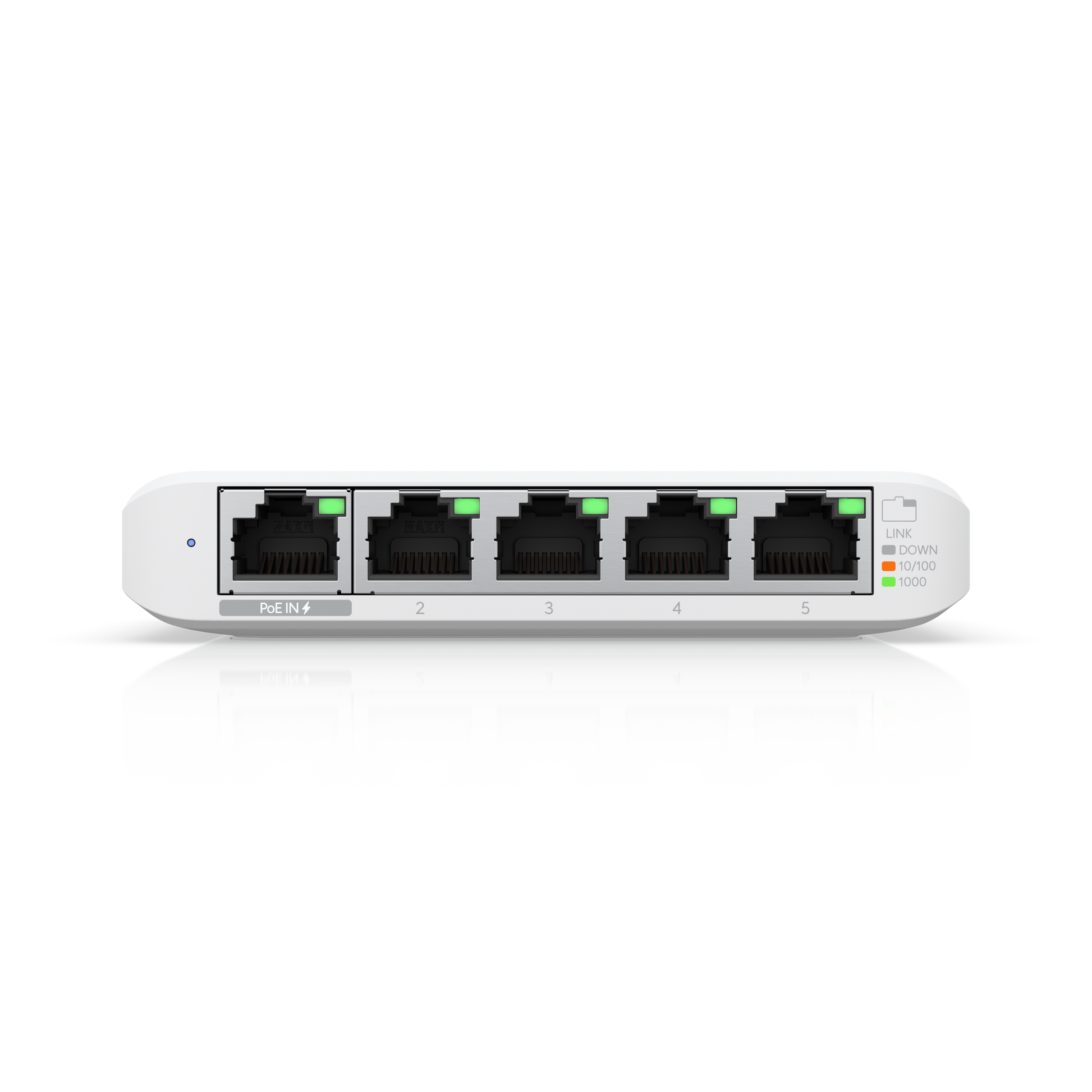 De UniFi Switch Flex Mini (USW-Flex-Mini) is een volledig beheerde Layer 2-switch met vijf Gigabit RJ45-poorten, ontworpen voor compacte en flexibele netwerkinstallaties. Eén van de poorten ondersteunt 802.3af PoE-invoer, waardoor de switch via een enkele netwerkkabel van stroom kan worden voorzien.